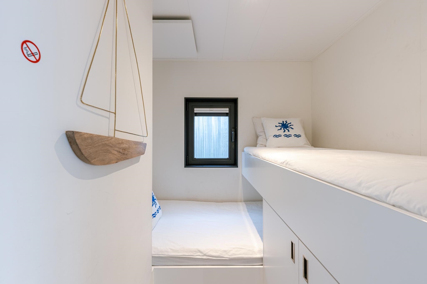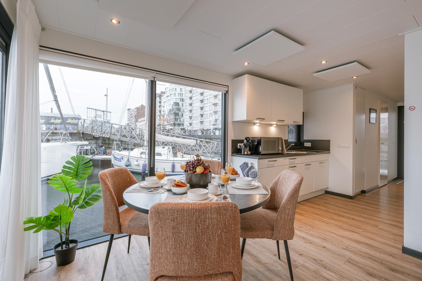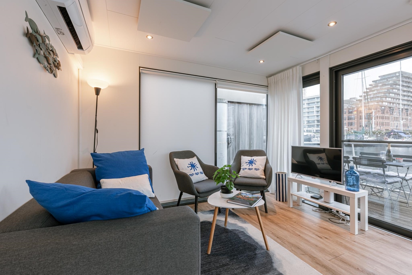 The houseboat offers stunning views of the iconic Mercator ship as well as other sailing and motor boats. On board, you’ll enjoy all the comforts you need: two bedrooms, one with a double bed and one with bunk beds, and a bathroom with a shower. The fully equipped kitchen includes a refrigerator, dishwasher, and microwave. Outside, you can relax on your private waterside terrace or on the sunny upper deck – the perfect spot to unwind.