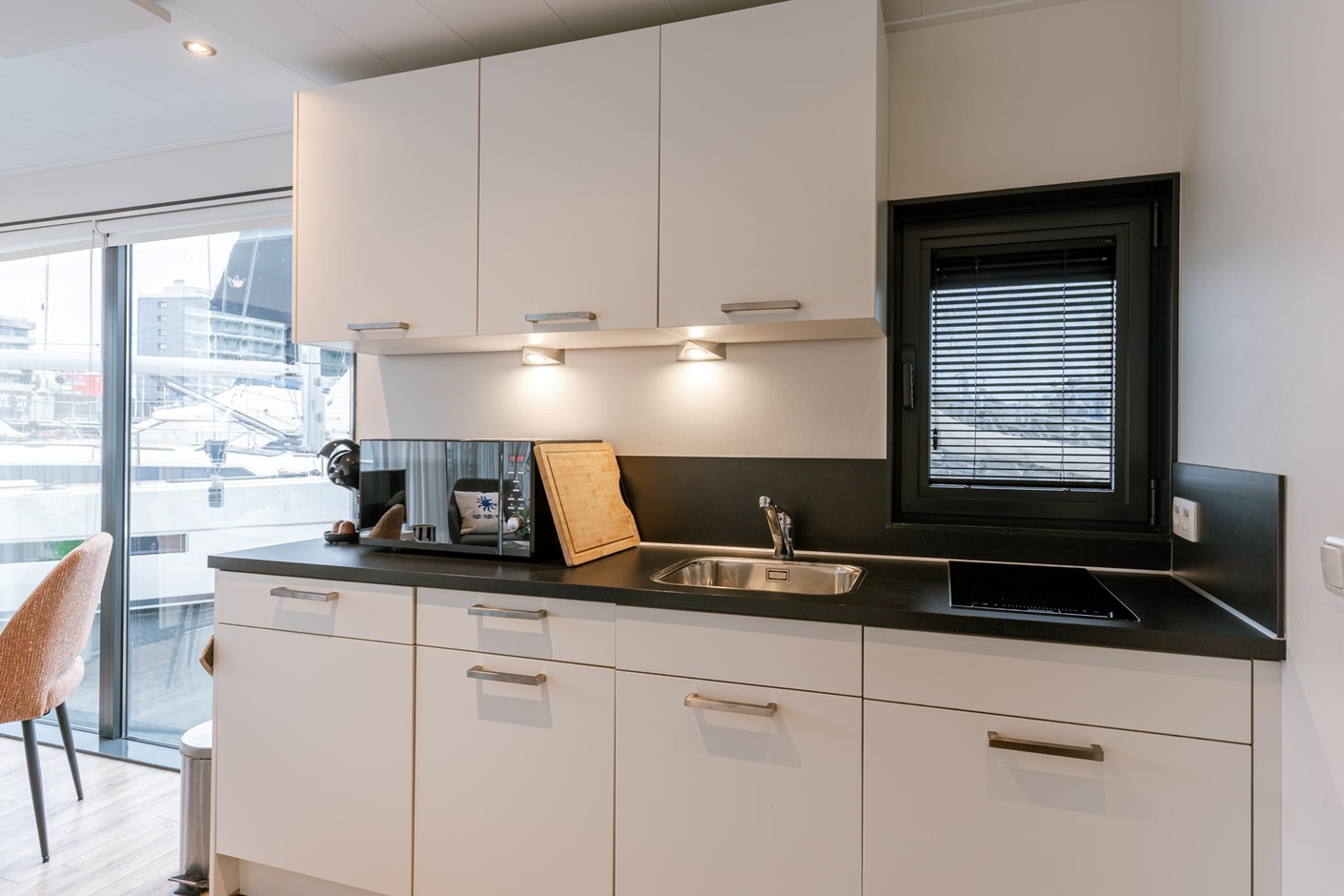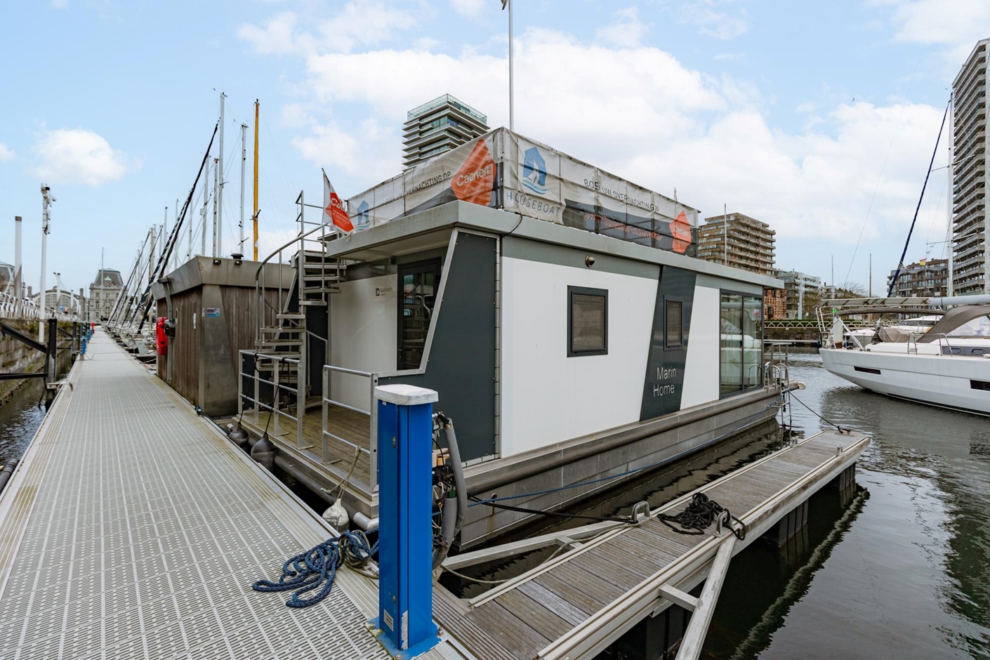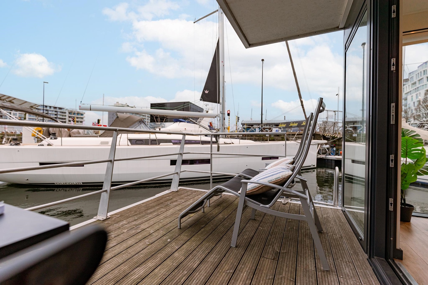 The houseboat offers stunning views of the iconic Mercator ship as well as other sailing and motor boats. On board, you’ll enjoy all the comforts you need: two bedrooms, one with a double bed and one with bunk beds, and a bathroom with a shower. The fully equipped kitchen includes a refrigerator, dishwasher, and microwave. Outside, you can relax on your private waterside terrace or on the sunny upper deck – the perfect spot to unwind.