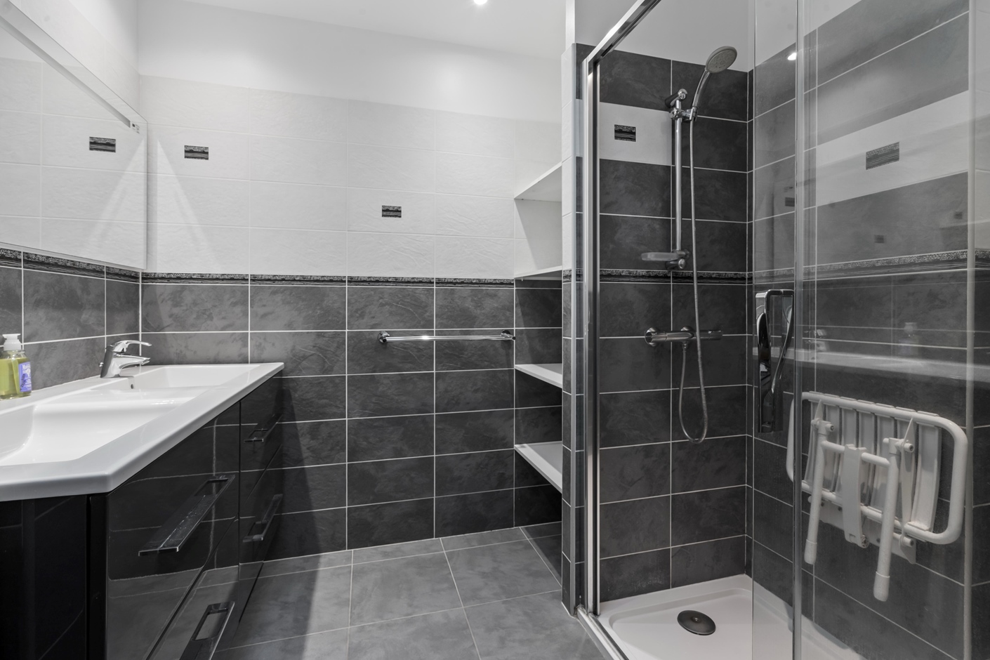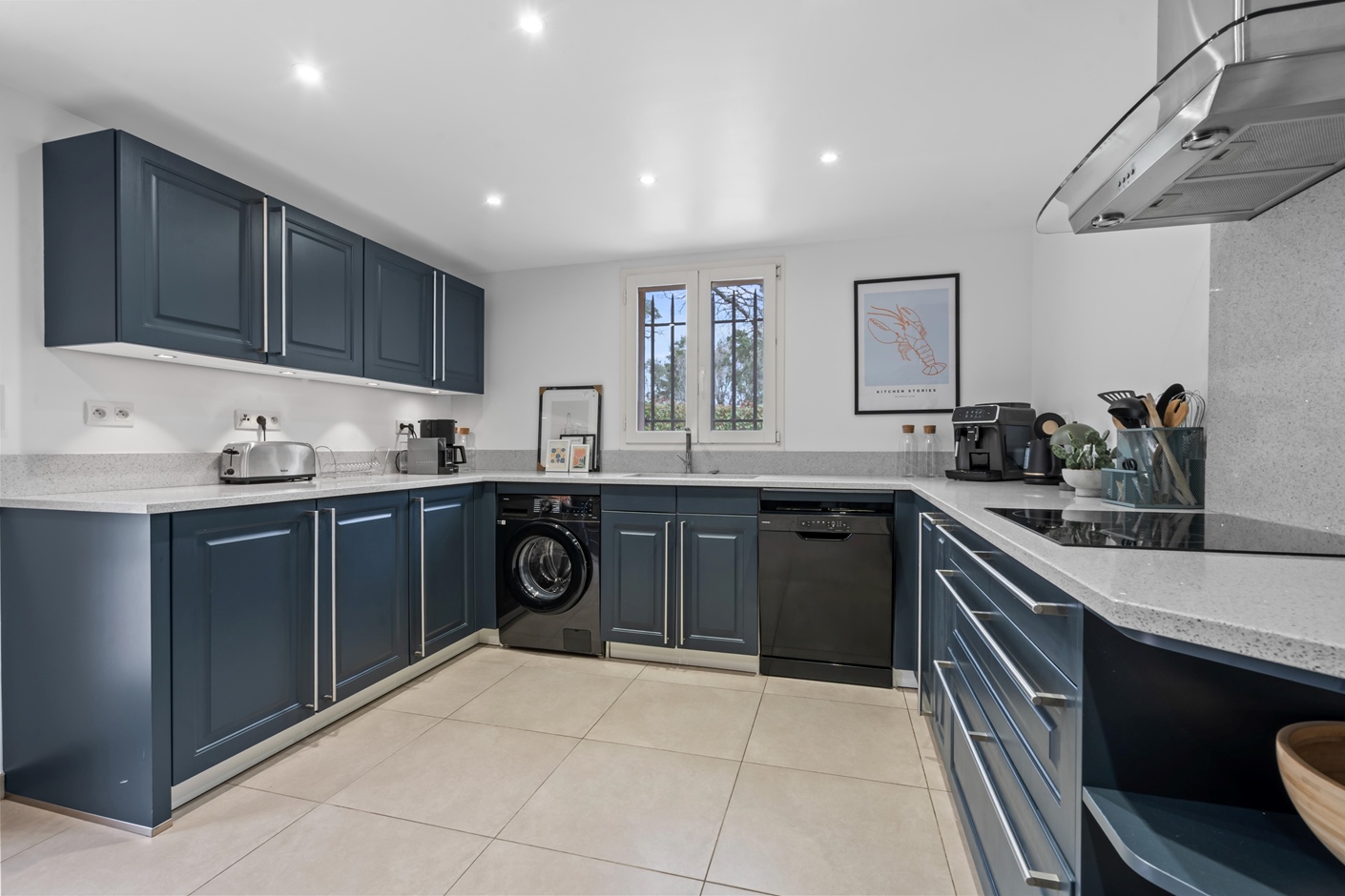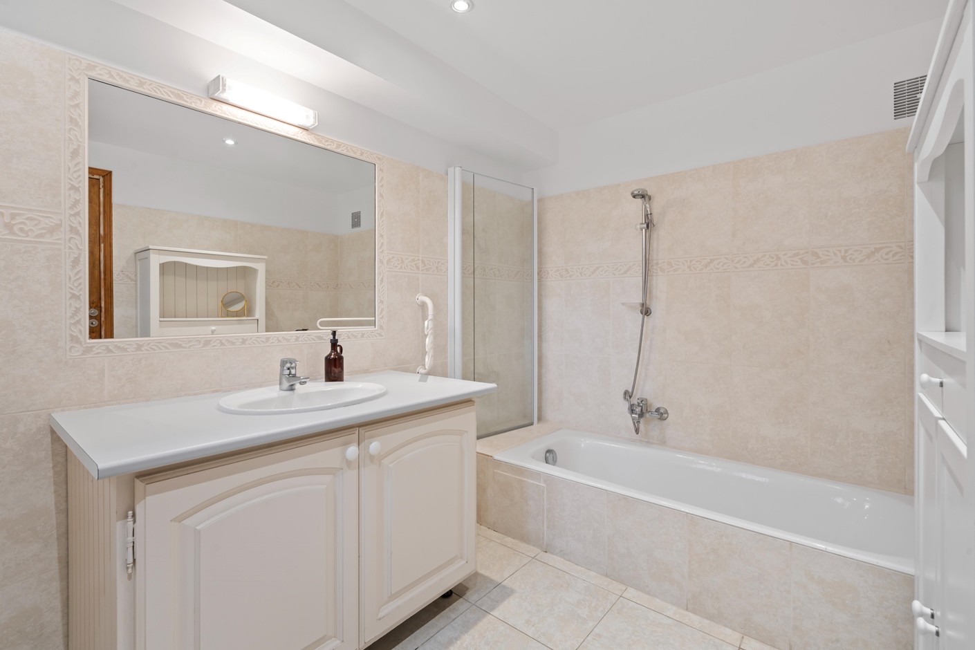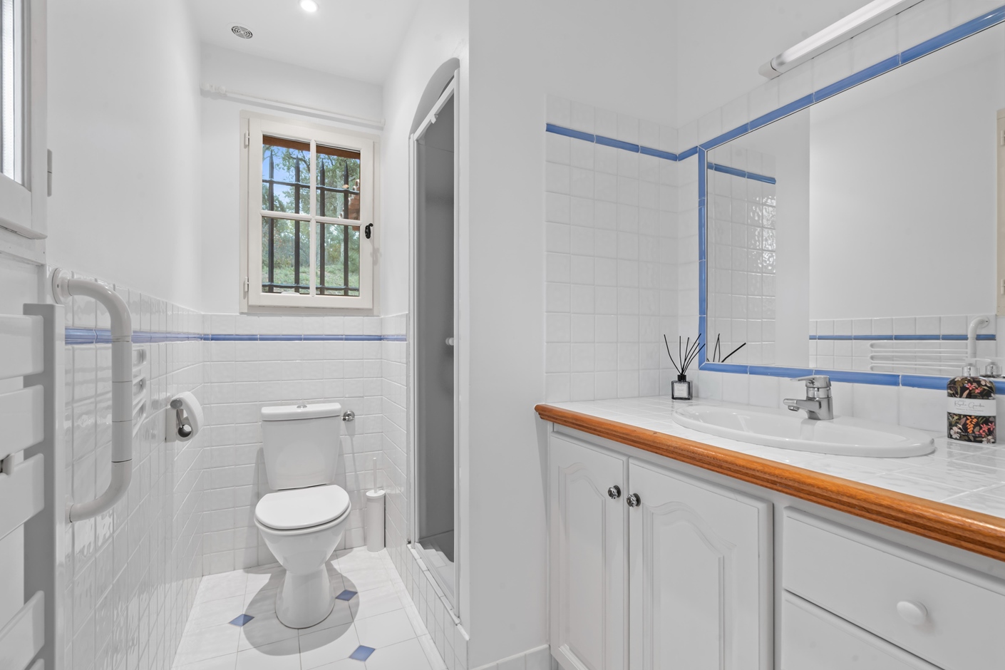 The villa offers modern comfort and everything you need. On the ground floor, you’ll find four bedrooms and two bathrooms. The first bathroom is equipped with a toilet, sink, and shower, while the second features a bathtub with a shower option and a sink. Upstairs, there are two additional spacious bedrooms and a third bathroom with a shower and double sink.
